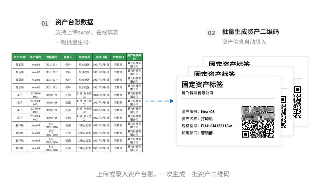 导入准备好的资产台账 Excel 表或输入二维码生成个数,即可批量生成固定资产二维码。