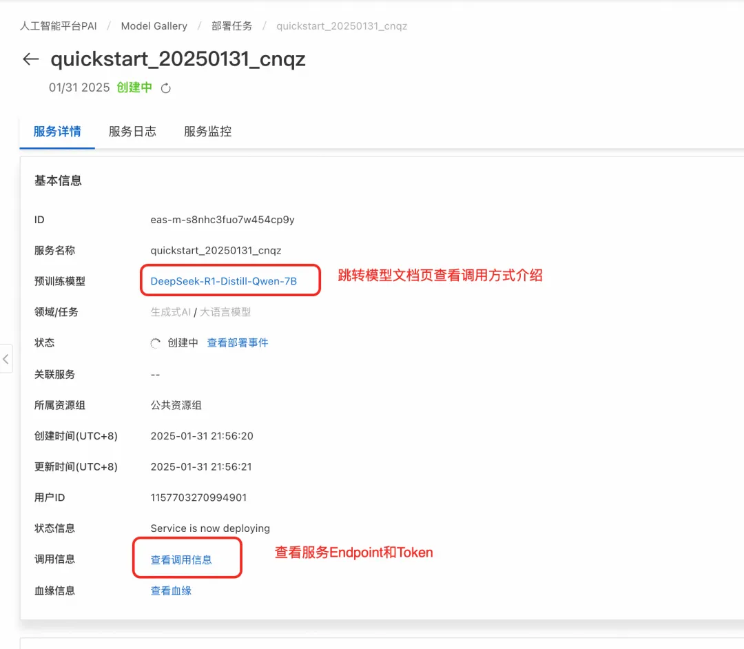 部署成功后,在服务页面可以点击“查看调用信息”获取调用的Endpoint和Token,想了解服务调用方式可以点击预训练模型链接,返回模型介绍页查看调用方式说明。