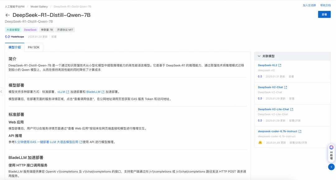 为了更高性价比地实现DeepSeek系列模型与现有业务的高效融合,本教程部署的模型为蒸馏过后的DeepSeek-R1-Distill-Qwen-7B。基于 DeepSeek-R1 的推理能力,通过蒸馏技术将推理模式迁移到较小的 Qwen 模型上,从而在保持高效性能的同时降低了计算成本。同时,阿里云PAI Model Gallery也提供 DeepSeek-R1、DeepSeek-V3原始模型的一键部署。