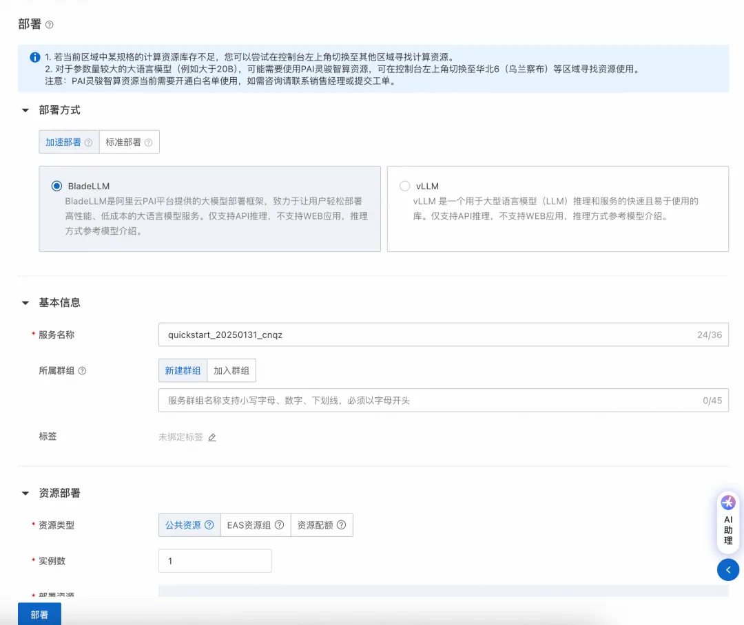 单击右上角部署:目前DeepSeek-R1支持采用vLLM加速部署;DeepSeek-V3 支持vLLM加速部署以及Web应用部署;DeepSeek-R1蒸馏小模型支持采用BladeLLM(阿里云PAI自研高性能推理框架)和vLLM加速部署。选择部署方式和部署资源后,即可一键部署服务,生成一个PAI-EAS服务。