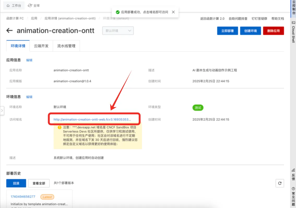部署完成后,用户可以通过访问域名快速体验AI动画创作。然而,如果不小心关闭了右侧的操作面板,之后很难再找到之前的访问域名,缺少一个便捷的二次入口。