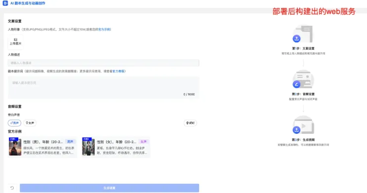 通过部署完成后的“访问域名”,我们可以打开如下部署后生成的网站,接下来,我们就可以进行AI动画创作了。