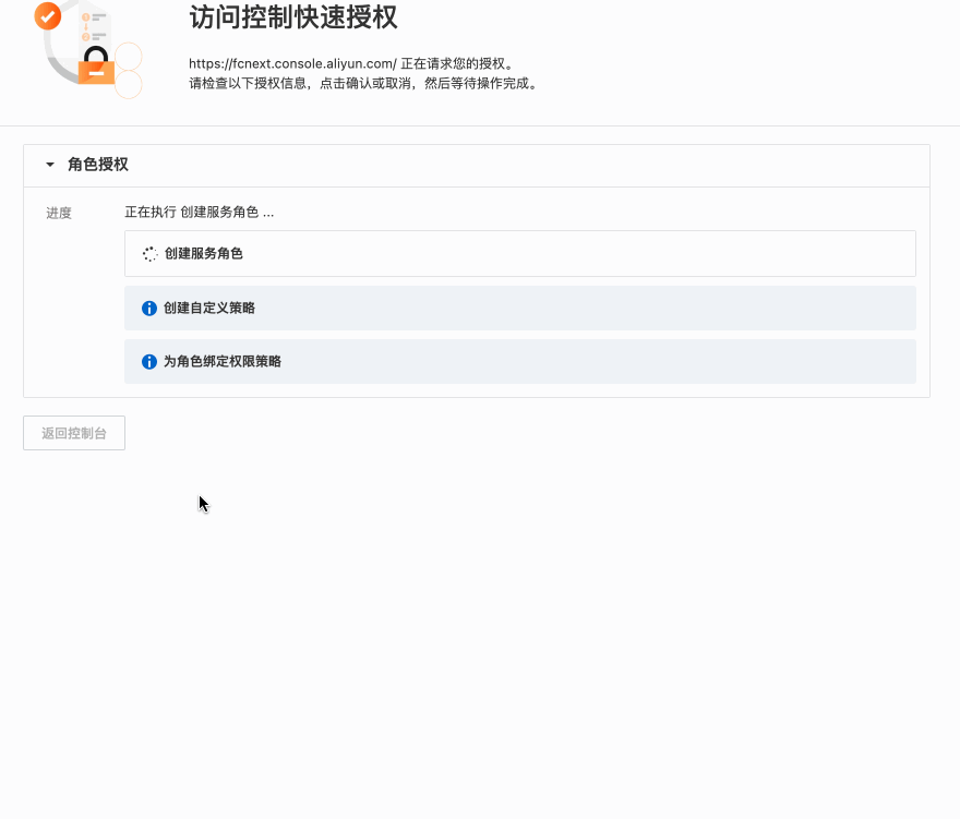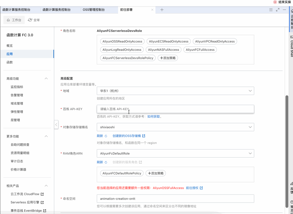RAM角色ARN | 函数计算访问对象存储OSS服务时使用的函数角色。 | 如果提示您当前选择的应用还需要额外一些权限,请单击前往授权。 |