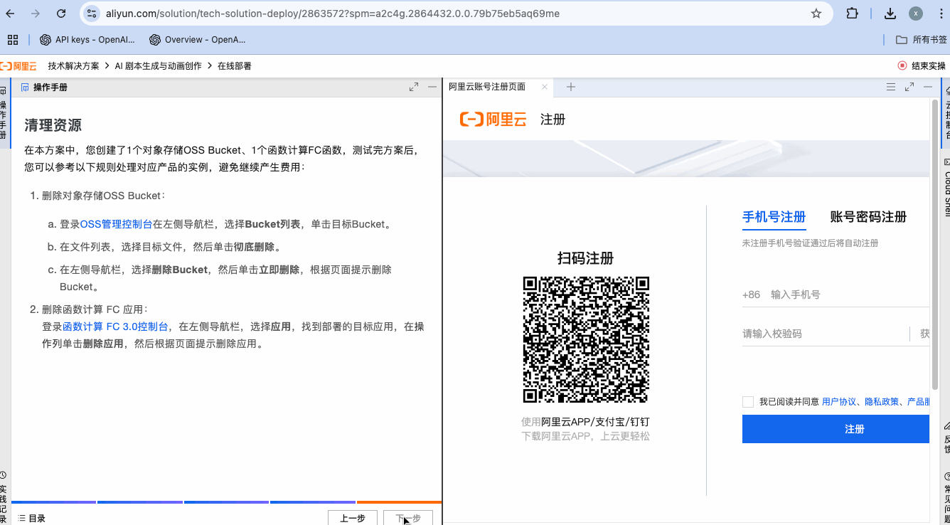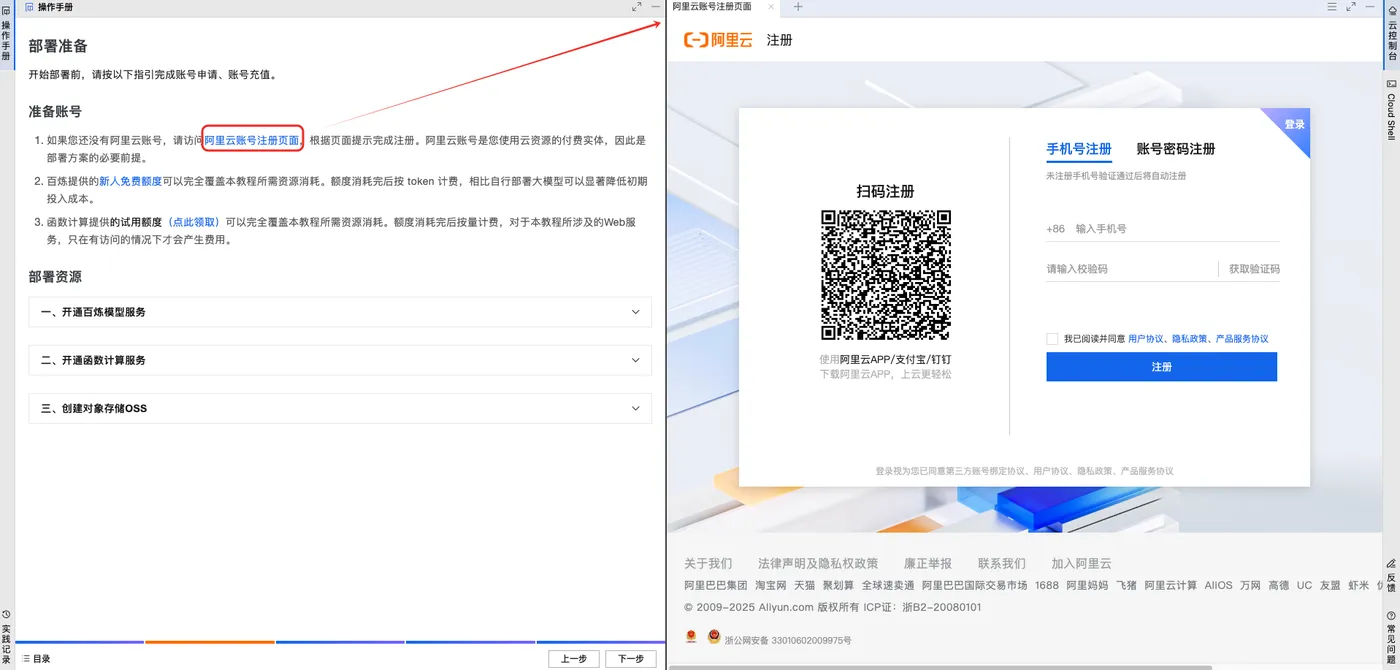 因此,在部署前,我们需要按照部署方案指引,先完成 阿里云账号注册 、 开通阿里云百炼大模型服务 、开通函数计算服务及登录 OSS管理控制台创建对象存储OSS。