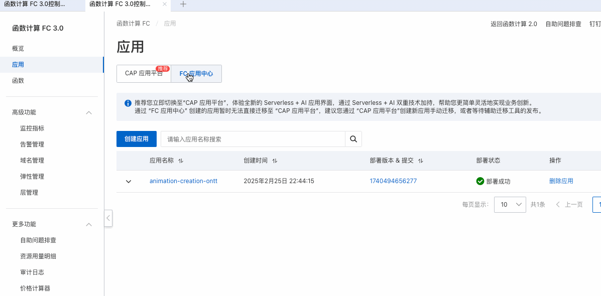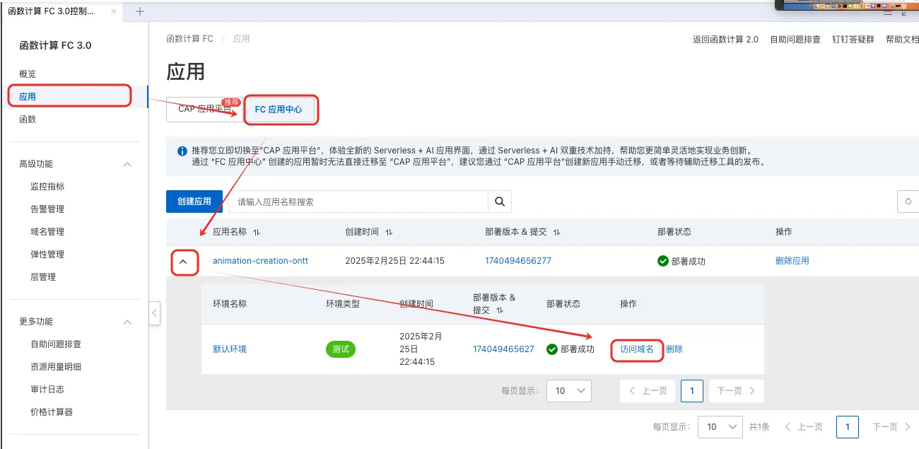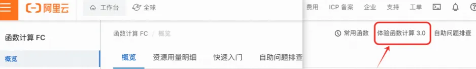 注意,此方案官方推荐使用函数计算FC3.0,如果不是,单击函数计算页面右上角体验函数计算3.0进行切换。