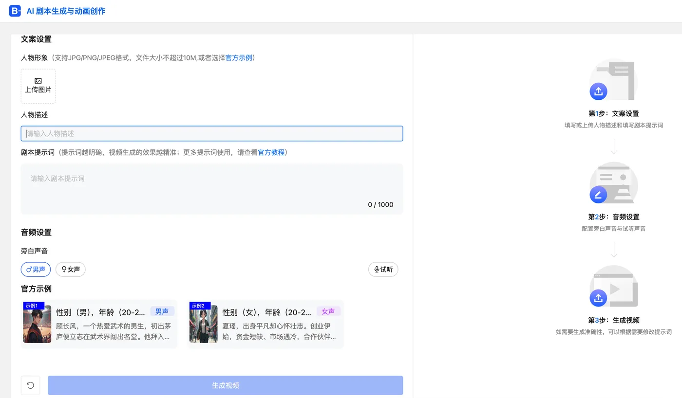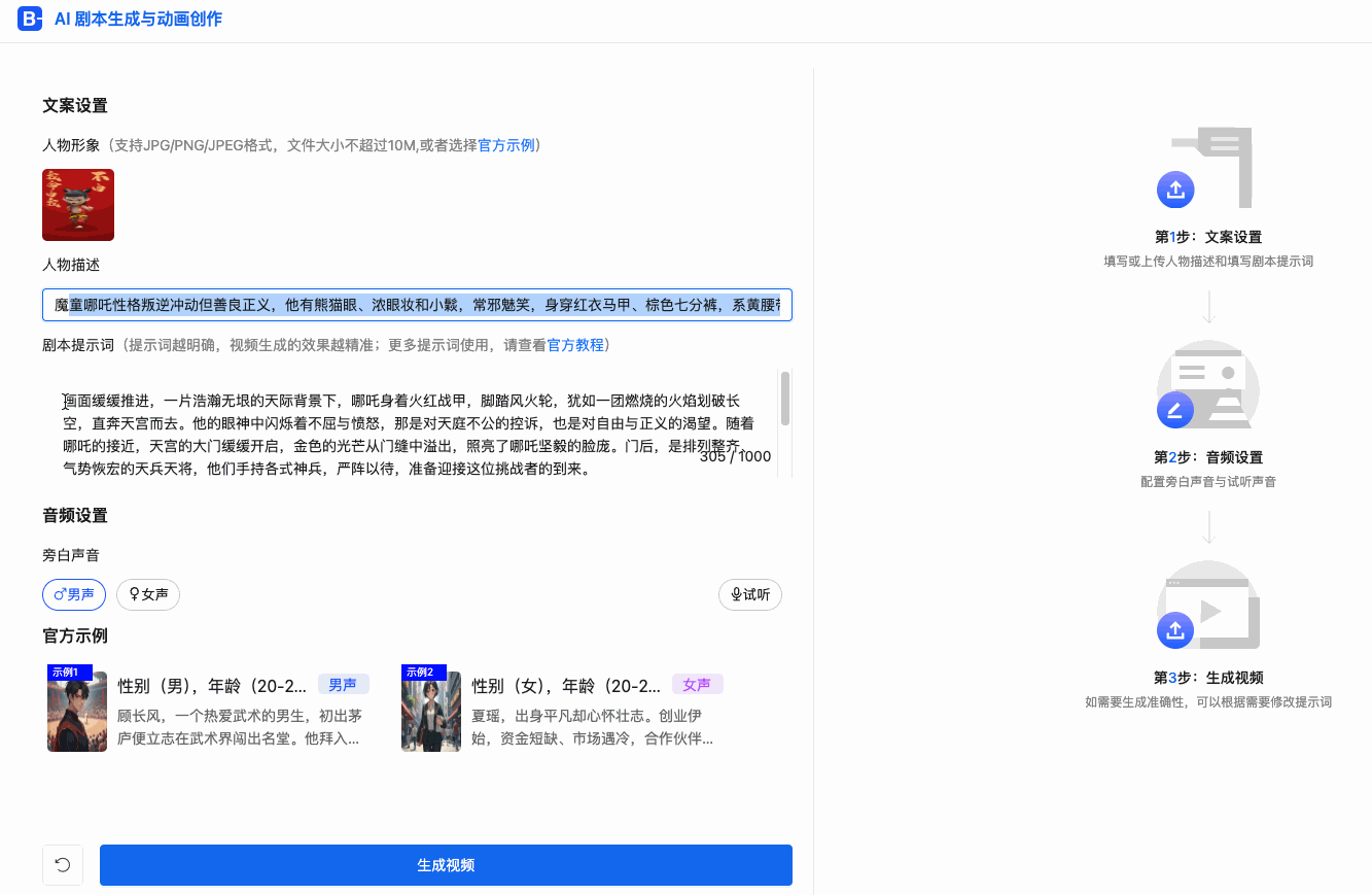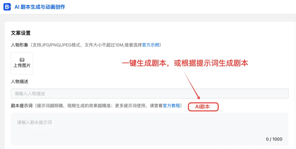 目前,AI生成动画的页面功能较为简单。建议增加一个按钮,用于自动生成剧本提示词,这样用户可以更快速地体验功能,无需费力构思文案。