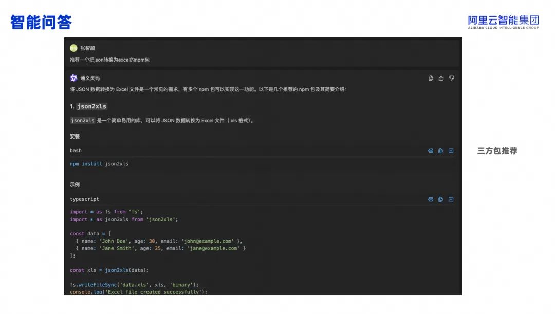 在探索通义灵码的应用时,我尝试利用智能问答功能询问与 MongoDB 相关的问题。在以往,我们可能需要查阅文档或向搜索引擎提问,但通过通义灵码,我可以直接在插件中提出问题,而通义灵码会给出显著个性化的答案,这是不是对提升工作效率很有帮助?此外,我还请求通义灵码推荐一个将 json 转换为 excel 的 NPM 包,它迅速提供了两个令人满意的方案。