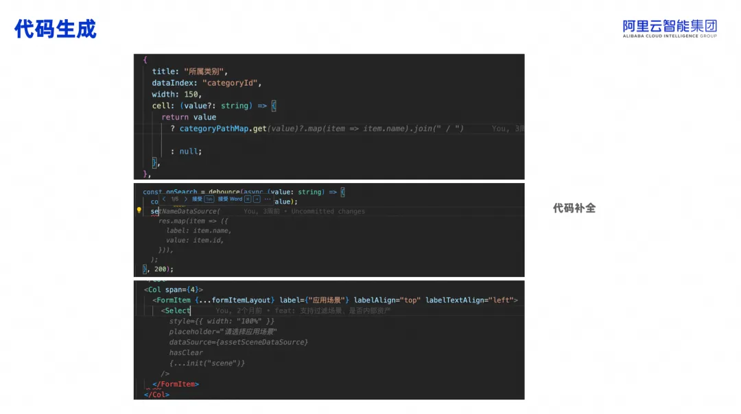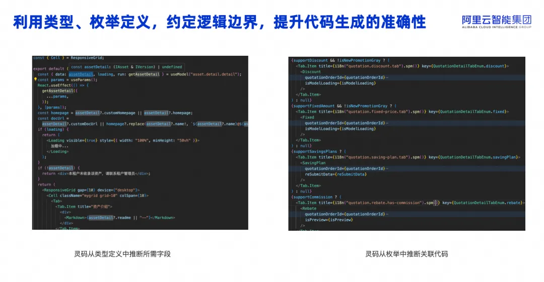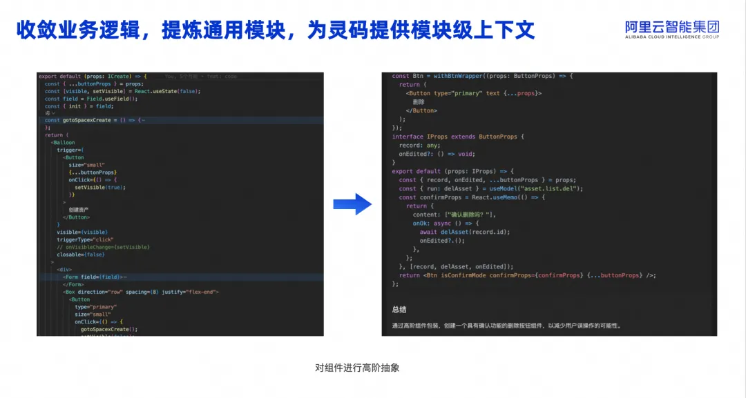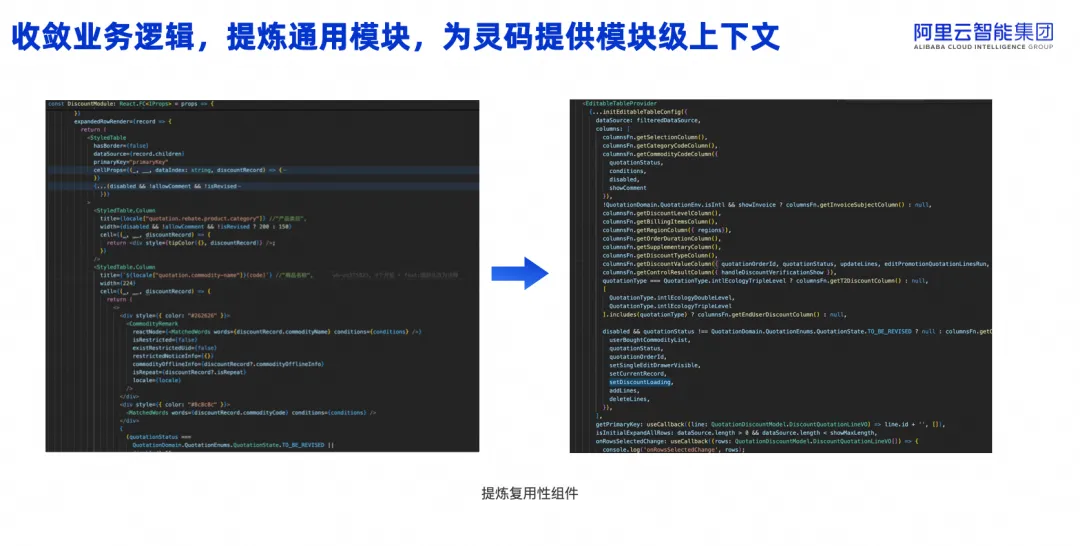 然而,如果我们对相似组件进行更高级的抽象,灵码就能基于这种抽象得到模块级上下文,从而让灵码能够为这些组件生成更完整的代码。右侧展示了经过抽象和代码生成后,我们得到了一个更优秀的生成结果。
