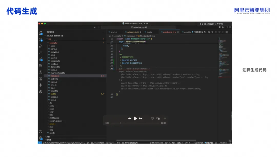 注释生成代码也是一个有趣的场景。在编程过程中,我们给出自然语言的描述,通义灵码就能基于当前上下文生成所需的代码,既可以是代码行,也可以是代码块。如截图所示,我描述了接口的定义,并得到了相应的接口实现。