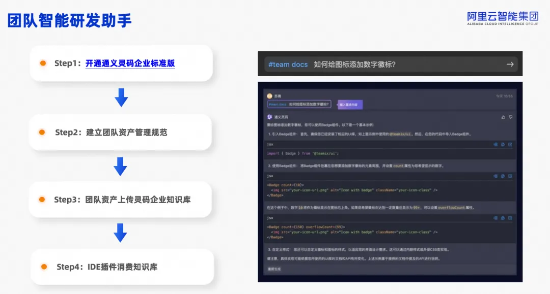 上面的流程介绍了如何利用通义灵码的企业知识库搭建基础的团队智能研发助手,更为强大的定制化能力,则需要团队亲自去探索,从而搭建符合业务需要的系统。首先,我们需要开通通义灵码的企业标准版。在团队资产管理规范建立的基础上,将团队资产上传到通义灵码的企业知识库。之后通过一系列配置,可以构建一个 IDE,在该 IDE 插件上可以消费知识库,从而有效提升通义零码的生成效果。右侧是一个案例,展示了如何在 IDE 中消费通义灵码的 RAG 能力。通过添加 #team docs 的 tag,即可调用知识库中的资产。05