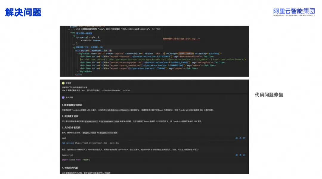 另一个是代码问题修复能力。在这方面,我通过选择问题代码并使用通义灵码的一键修复功能,通义灵码能够基于整个工程和项目分析错误原因,并提供修复建议。我们可以看到,它能够从整体工程角度进行判断,这与我们曾经接触的问题分析工具显著不同。以往的代码修复工具往往给出的建议不够清晰,而通义灵码的修复建议具有很高的结构化程度。