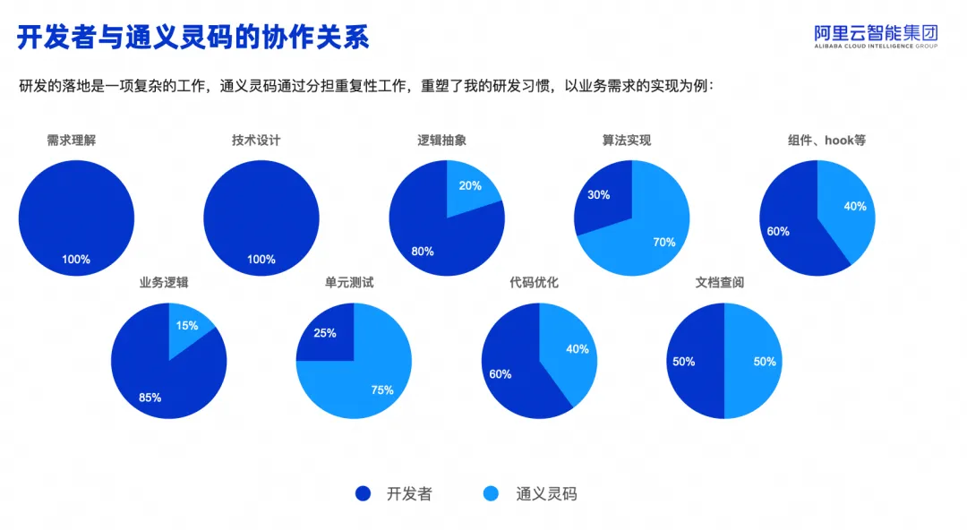 最后我给出一些个人总结,这张图片是我定义的我与通义灵码的协作关系。以业务需求的实现为例,可以看出,需求理解、技术设计这些仍然需要人为的全程参与,但在逻辑抽象方面,已经可以有通义灵码的介入。此外,通义灵码在后续编码实现中提供的助力也非常明显。