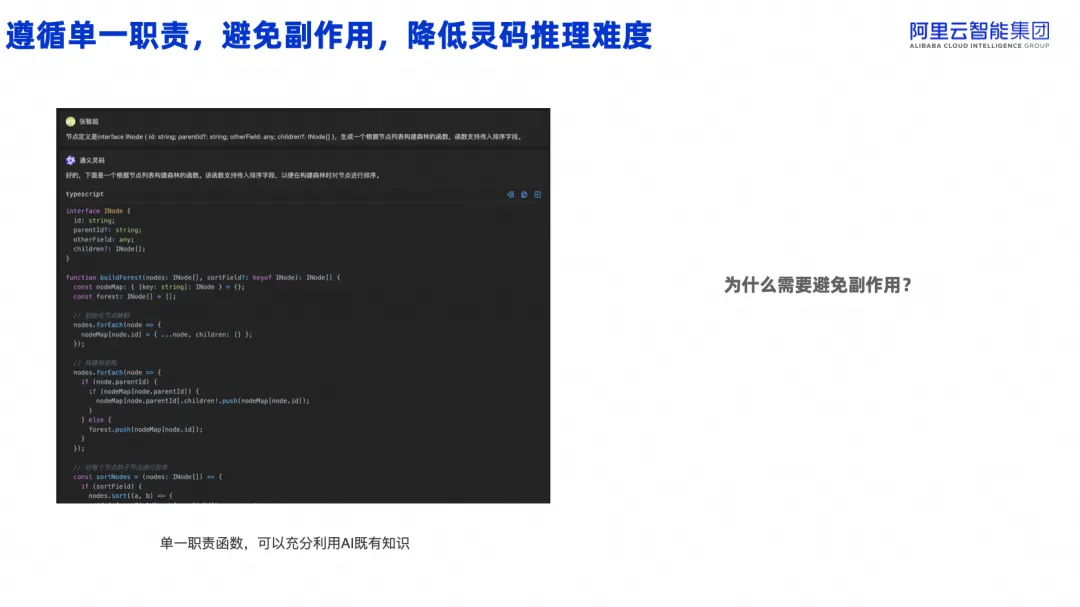 接下来的案例是函数的实现。通过避免副作用,让灵码去生成遵循单一职责的函数,可以有效的降低灵码的推理难度。利用它已有的知识,可以得到更高采纳率的函数实现。这里有一个问题,就是为什么要避免副作用?