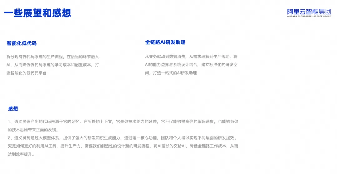 最后,我想分享一些展望和感想。随着未来像通义灵码这样的 AI 工具的介入,我们的一些经典研发平台,例如低代码研发平台将会得到重塑。通过引入 AI,可以降低低代码研发系统的学习和配置成本,构建智能化的低代码平台。未来,通过将 AI 全面融入研发流程,我们有望创建一个集成的一站式研发助理。