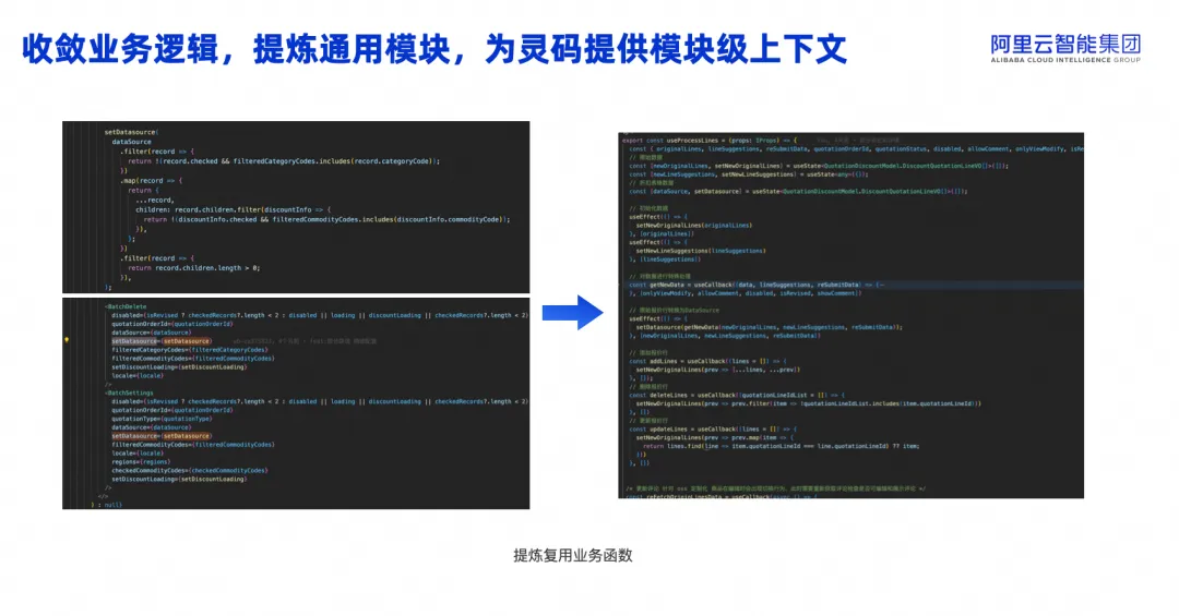 在日常开发中,我们经常遇到下图左侧的代码案例。不难看出,这段代码的问题在于业务逻辑与具体实现过程的紧密耦合。即便我们使用了通义灵码的补全能力,生成的代码依然遵循这种模式,无法摆脱业务与实现的耦合。因此,我们只能在这种模式下不断地实现后续的业务逻辑。然而,通过对代码进行提炼,将可复用的部分提取为可复用组件,并解耦业务逻辑与组件的实现,我们可以得到右侧结构清晰的实现方案。在此过程中,我们可以利用灵码来实现组件。一旦我们有一个通用组件实现,灵码将利用模块级上下文,在此基础上继续补全所需的业务逻辑。