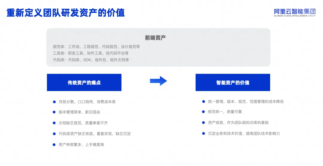 传统资产的痛点包括存储分散、消费成本高,例如版本管理较为粗放,文档缺乏规范,代码类资产缺乏整合,导致团队成员重复实践缺乏沉淀,另外由于缺乏有效管理,资产种类繁多,新员工上手难度高。通过引入知识库概念,我们便可以重新对资产价值进行评估,并更有效地管理资产。