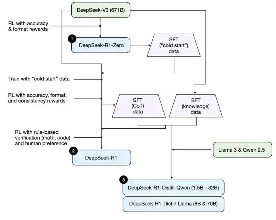 是在基础模型DeepSeek-V3上进行强化学习(RL)后得到了DeepSeek-R1-Zero模型。该模型学会了如何推理、创建思维链序列,并具备自我验证和反思等能力。尽管DeepSeek-R1-Zero的学习能力令人惊叹,但它存在语言混合、可读性差等严重问题。