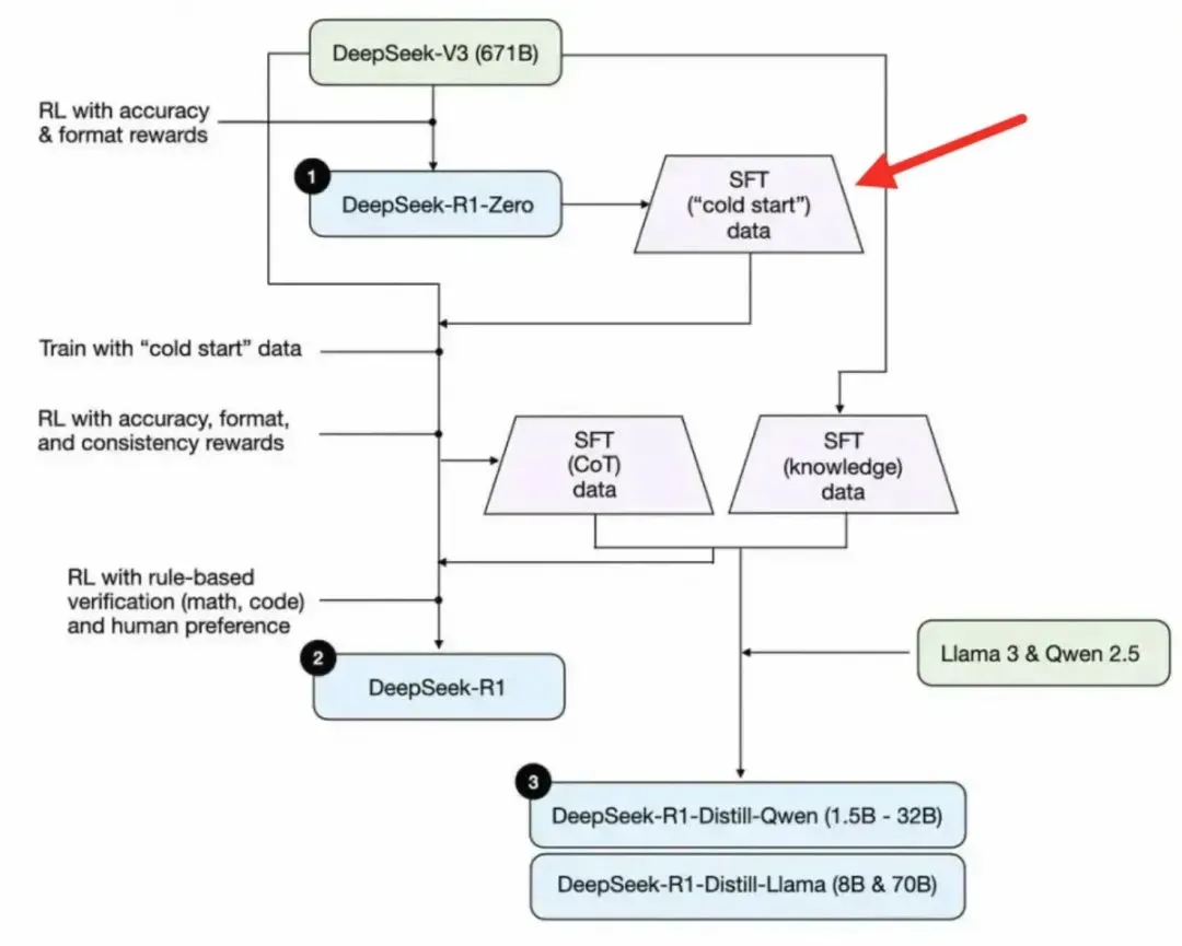 我们可以看到模型在早期训练的时候,效果很差,模型基本都是在瞎试。所以为了加快训练,deepseek加入了SFT的数据解决冷启动的问题,如下面的截图所示。通过R1-Zero生成SFT的数据,解决了R1的冷启动问题。