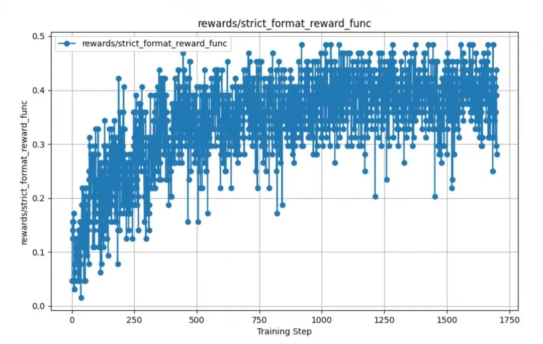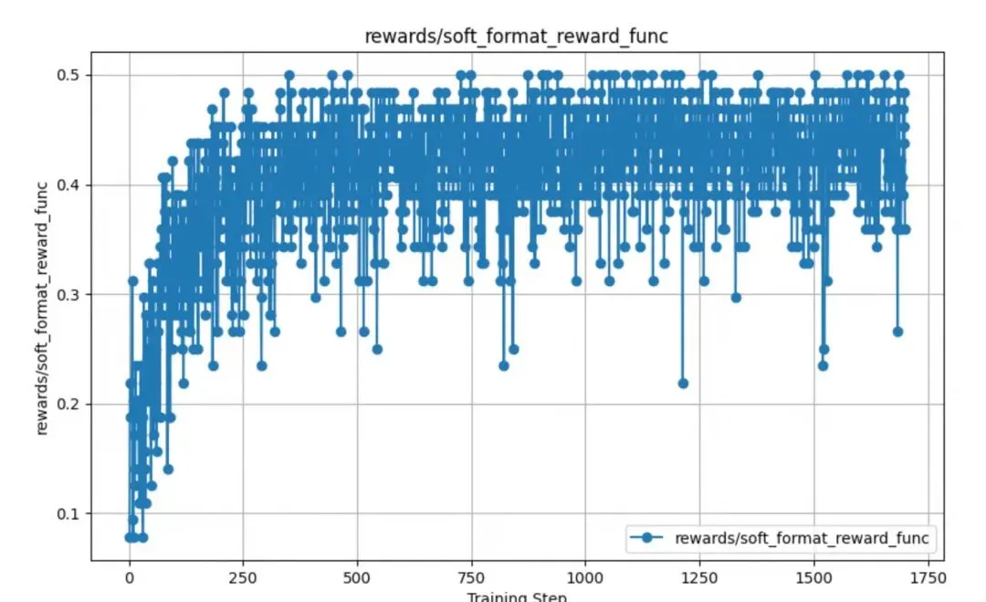 通过对训练后的奖励函数数据进行分析发现,其中模型的格式奖励函数strict_format_reward_func和soft_format_reward_func,都是在训练到固定步数左右的时候,得分开始突然上升,然后后续就逐渐稳定,如下图所示。可以看到,宽松校验在500步的时候已经基本稳定到0.5的分数,而由于严格模式对格式更加严格,所以严格模式在1000步的时候才到稳定。通过这样的数据,可以指导我们下一步进行实验数据调整,从而获取最佳的checkponit模型进行导出。