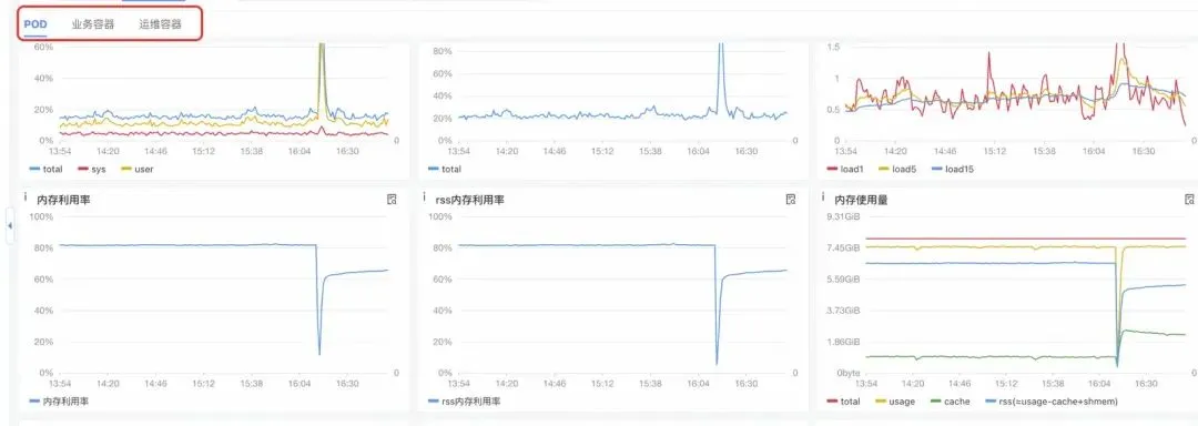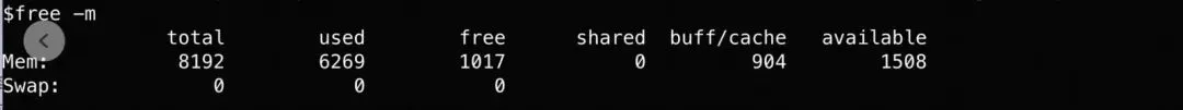 登陆机器,使用 free -m 查看内存使用情况,可以看到内存利用率为76.5% = 6269/8192,不过这里有一个问题,这个76.5%和sufire上的82%是对不上的,原因是我们登陆机器后看到的是业务容器内存利用率,在sunfire上面选择单机就能分别看到POD、业务容器、运维容器利用率。