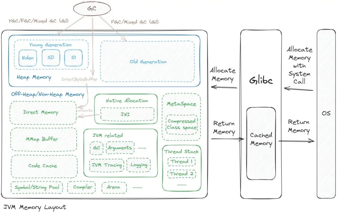 堆外内存通常指直接内存(Direct Memory),可以通过 java.nio.ByteBuffer 的 allocateDirect() 方法分配,它包含Mapped Buffer pool和Direct Buffer pool。与 Java 堆内存相比,堆外内存不受垃圾回收的影响,因此可以减少 Full GC 对应用性能的影响,但需要手动管理内存生命周期。在sunfire中,堆外内存的数据来自JMX的接口,可通过java.nio:type=BufferPool,name=direct和java.nio:type=BufferPool,name=mapped查询出来。