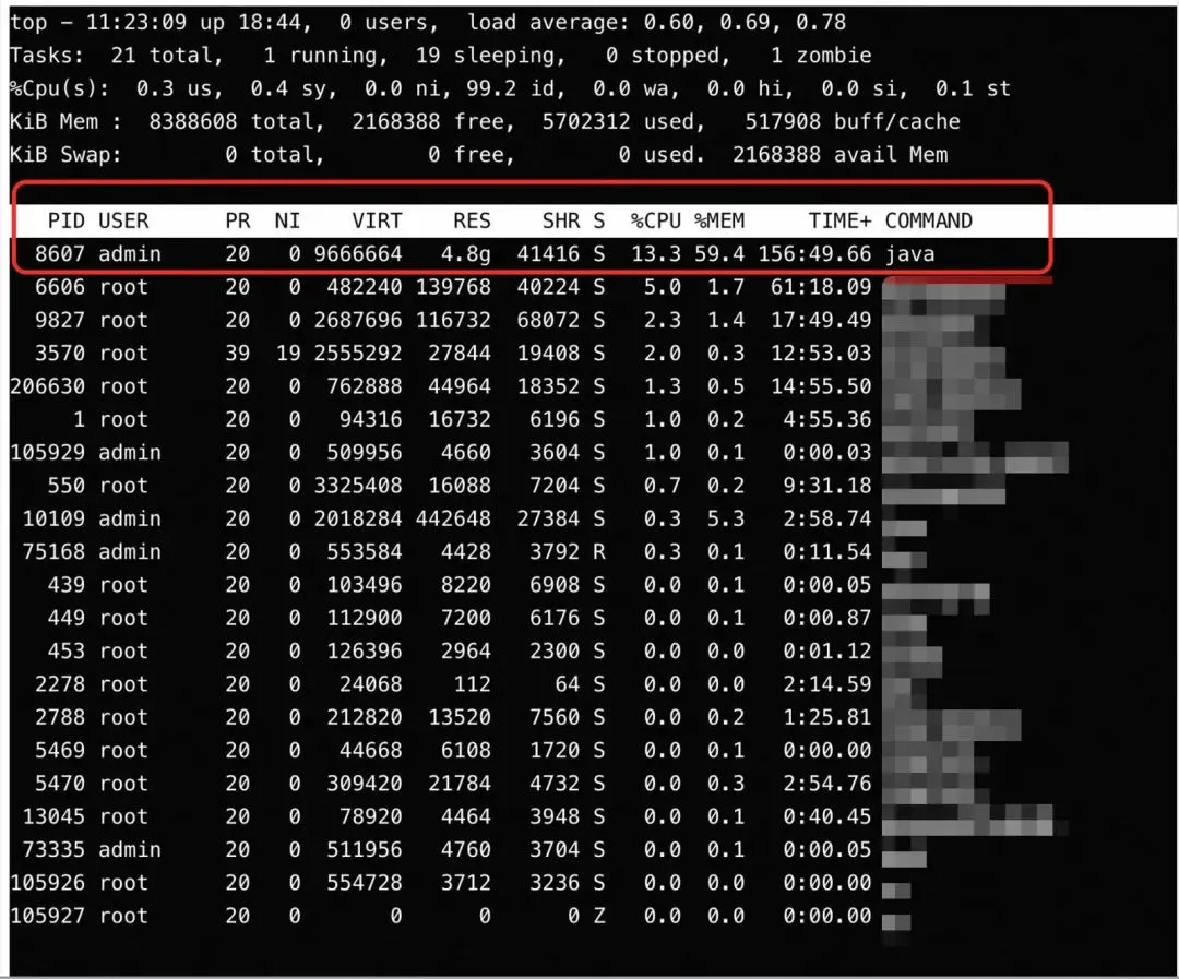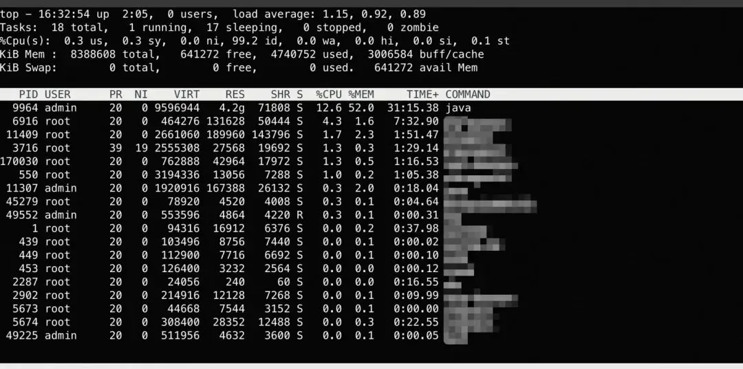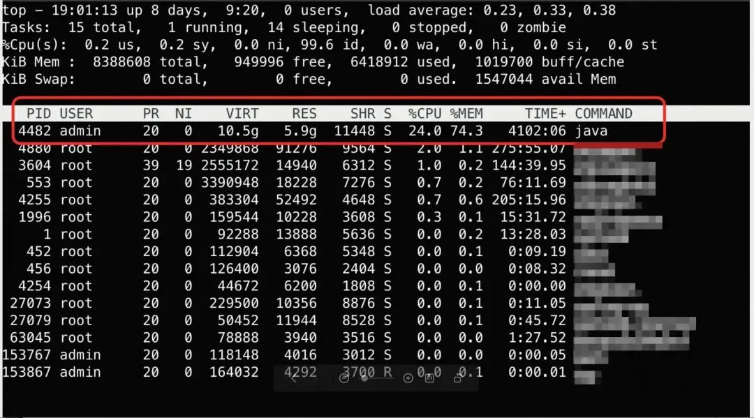 通过sunfire观察到运维容器内存利用率一直是比较稳定,重点需要分析的业务内存利用率,使用top命名查看各进程的内存使用情况,可以看到JAVA应用就占了74.3%,接下来继续分析JAVA的内存分布了。