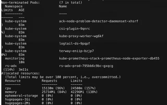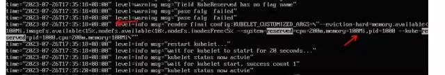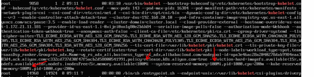 d) 客户反馈调小过系统的资源保留,因此我们也要看下kubelet的参数是否生效,可以看到,reserved的内存已经降低到了100m,说明调整已经生效了。