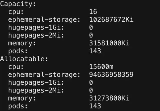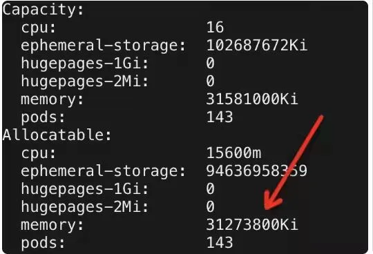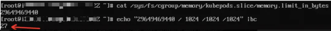 cgroup limit:% echo "scale=2; 27968328 / 1024/1024" |bc 26.67node Allocatable:% echo "scale=2; 31273800 / 1024/1024" |bc29.82