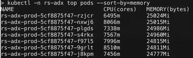 b) 我们看下pod的yaml对资源这块的设置,主业务确实是31G,以及当前是否有大内存使用的pod,发现多个25G左右的内存使用率pod。