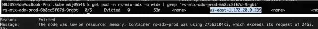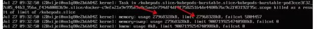 a) 找到驱逐状态的pod查看下驱逐的原因,可以看到这个pod的驱逐原因是节点内存不足,同时输出了这个container使用了约27G的内存,初始的request内存是24G。