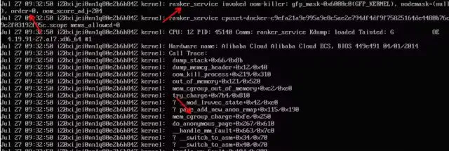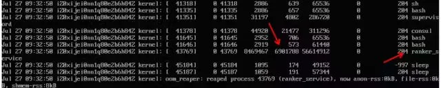 - OOM时统计到的进程内存开销信息,开销最大就是客户的ranker_service,并且最终这个进程被kill了。