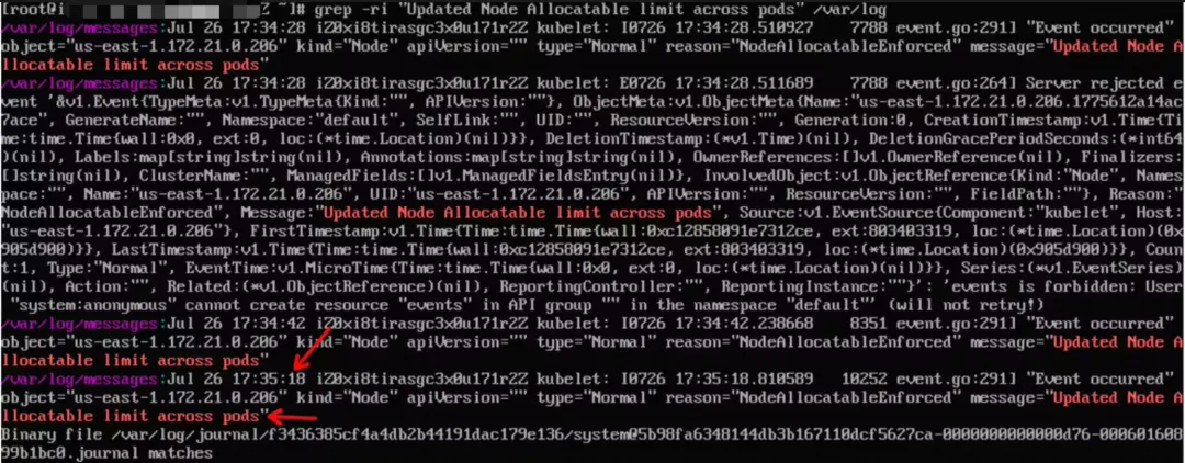 kubelet刷新cgroup的配置也是有日志记录的,我们可以通过关键词“Updated Node Allocatable limit across pods”看下同步的时间。