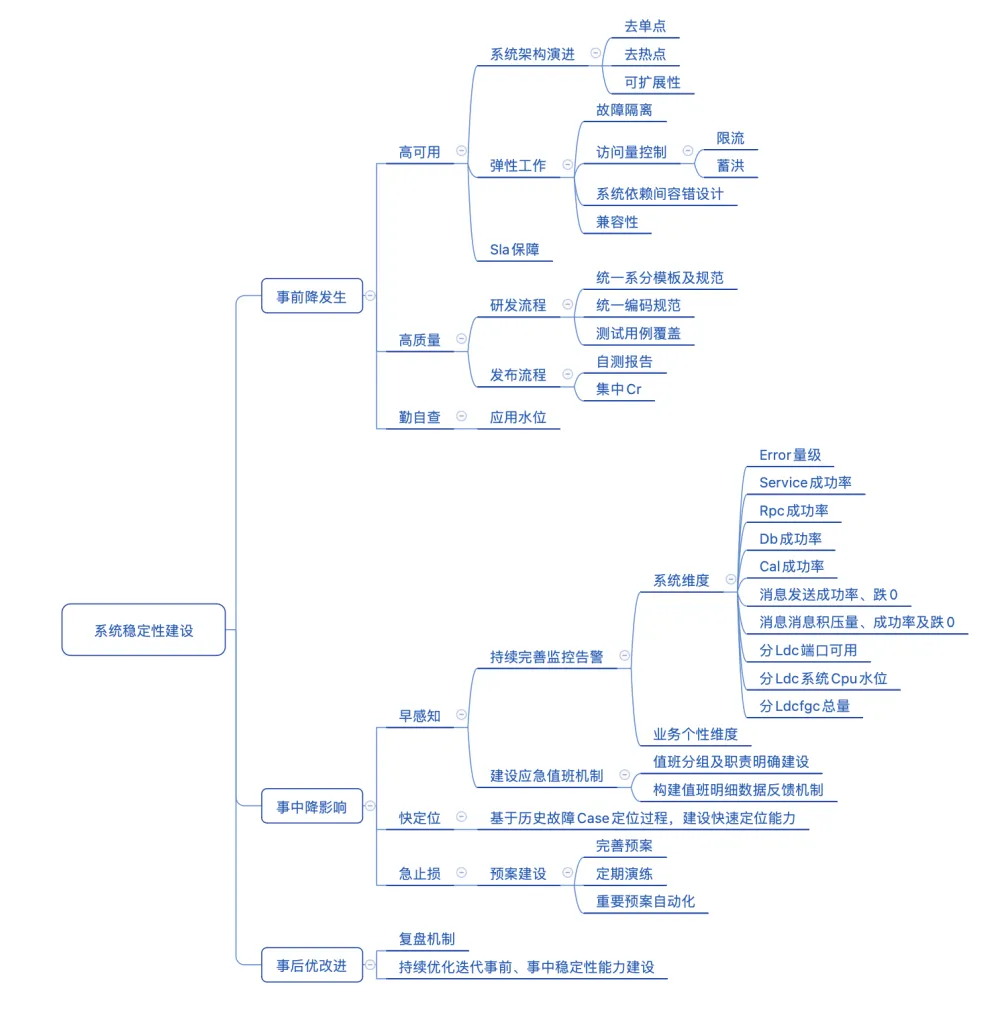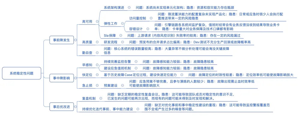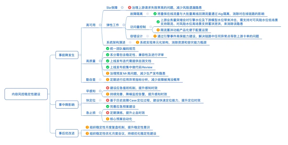 仅对当前列举的问题归纳分类,并不能确保系统的健康和稳定,单纯应对当下问题难免会留下不完善之处。经过进一步咨询、资料查阅与学习后,结合内容风控系统的特点,我将可能存在的隐患进行了进一步归纳总结,抽象形成了一套稳定性建设思路:
