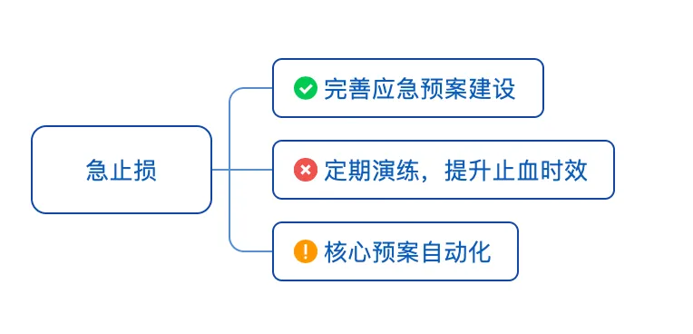 急止损:“止血”大于“修复”,故障发生后第一反应永远是“优先止损”。止损的时效提升能极大减少故障带来的影响。