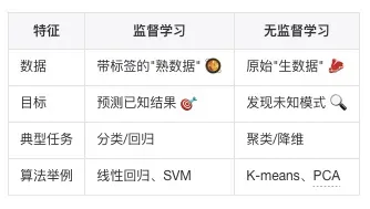 接下来,我需要确定监督学习和无监督学习的核心区别。监督学习有标签数据,无监督没有。这需要生活化的例子,比如老师改作业(监督)和学生自己分组(无监督)。然后概念讲解部分要解释两者的定义、特点和应用场景。简单记法可以用口诀,比如“监督有答案,无监督自己探”。