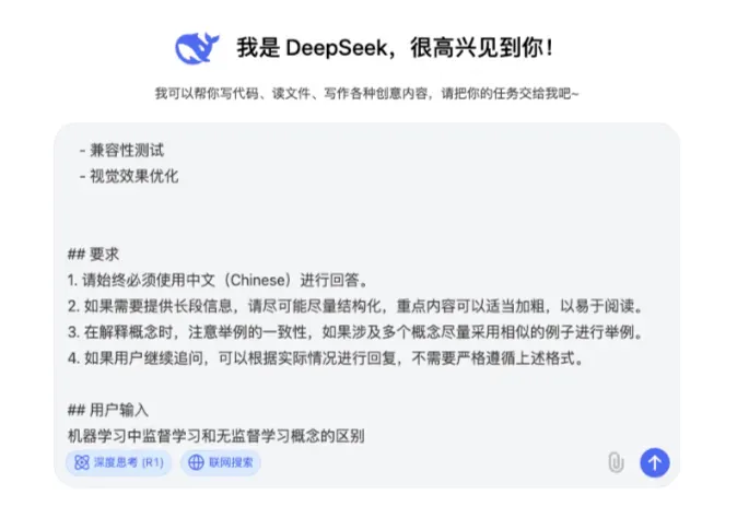 大家如果在不支持定义智能体的平台(如 DeepSeek 官网)上使用可以在提示词最后添加如下内容,告知哪些是提示词哪些是你得问题,发送给大模型即可: