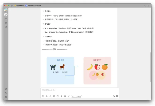 我们可以看到 AI 按照提示词的要求,先用生活化示例降低理解难度,然后用相对通俗的语言进行专业讲解,还提供了很有意思的“口诀记忆法”、“对比记忆法”强化我们的理解,最后给出漂亮的图示进一步加深我们的印象。