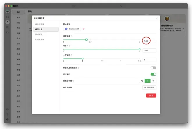 创建以后,点击编辑智能体,可以设置默认模型为刚才添加的阿里云百炼 DeepSeek-R1;注意一定要修改模型的温度,DeepSeek 官方建议 R1 模型温度设置为 0.6 效果更好。要保留在上下文中的消息数量,数值越大,上下文越长,消耗的 token 越多。普通聊天建议 5-10。在智能体编辑页面,将其“添加到助手”就可以对话了。