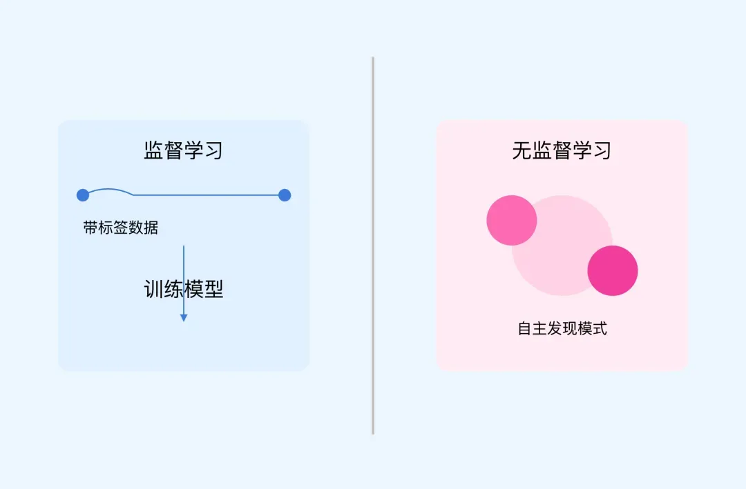 - 右侧粉色区域用重叠圆形表现无监督学习的数据自主聚类