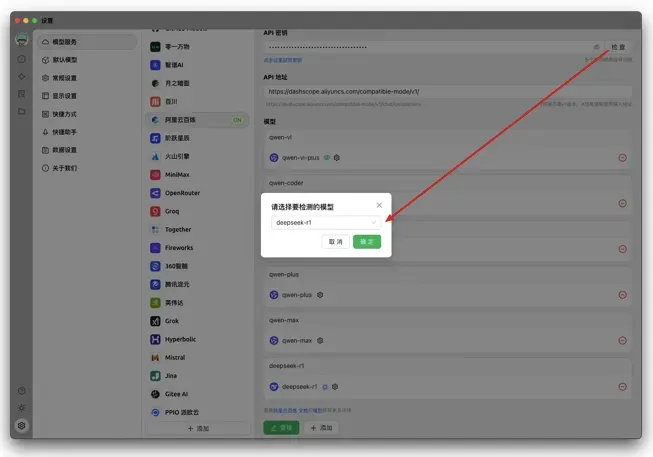 添加完模型,可以点击“检查”,选择 “DeepSeek-R1” 确认,如果页面弹出“链接成功”,说明配置成功。