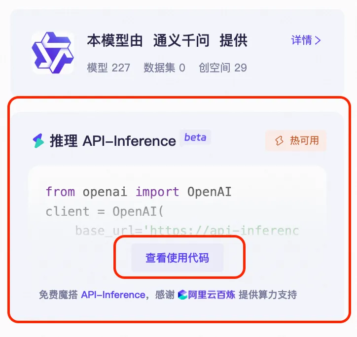 对于支持API-Inference的模型,在页面右侧就可以直接看到范例API调用代码:
