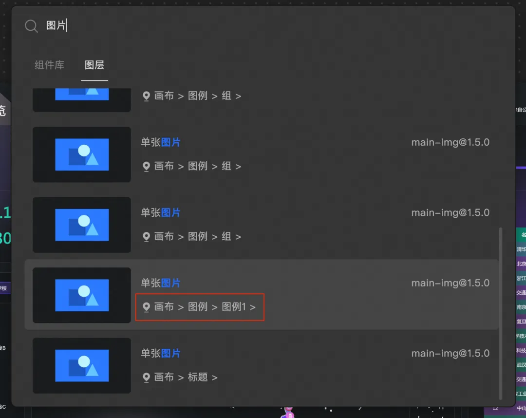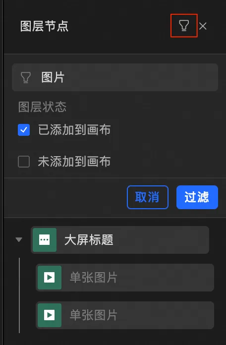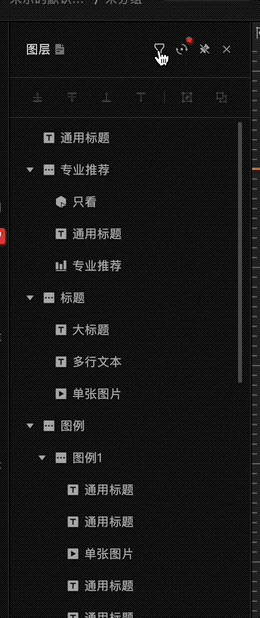 图层大纲树上可以搜索组件关键词过滤,并支持根据图层状态筛选(隐藏状态、锁定状态)