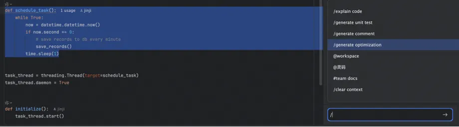 第三种方式是选择代码后在问答面板输入斜线(/)激活内置任务菜单,然后选择相应任务。