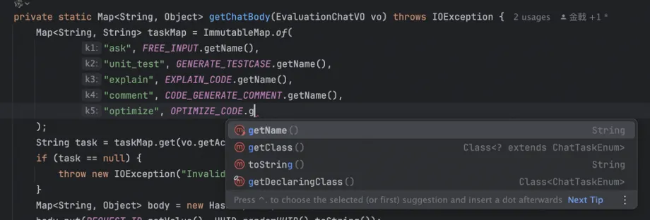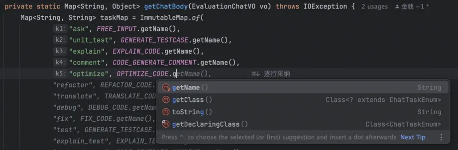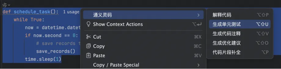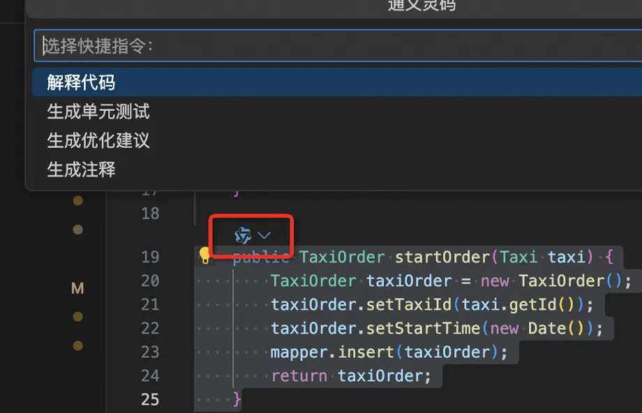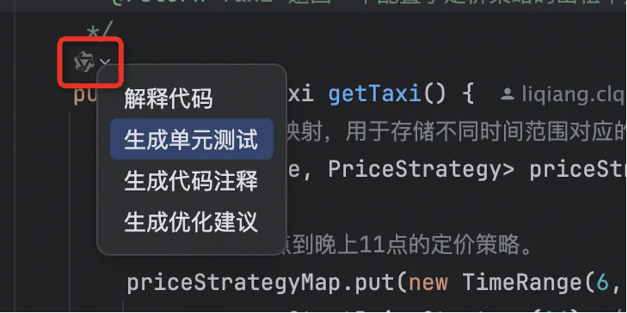 代码任务有三种使用方式,最常用的是在方法定义的开头,点击通义灵码小图标,在下拉选项中直接选择需要执行的任务。