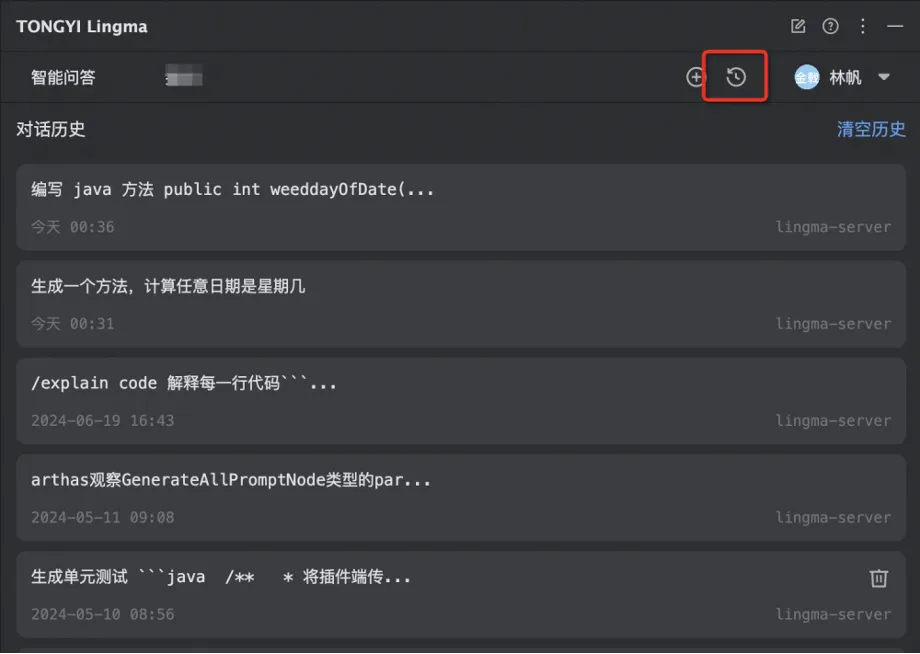 创建新的会话后,如果需要寻找此前提问过的内容,可以使用历史记录功能回到之前的话题,并继续追问。