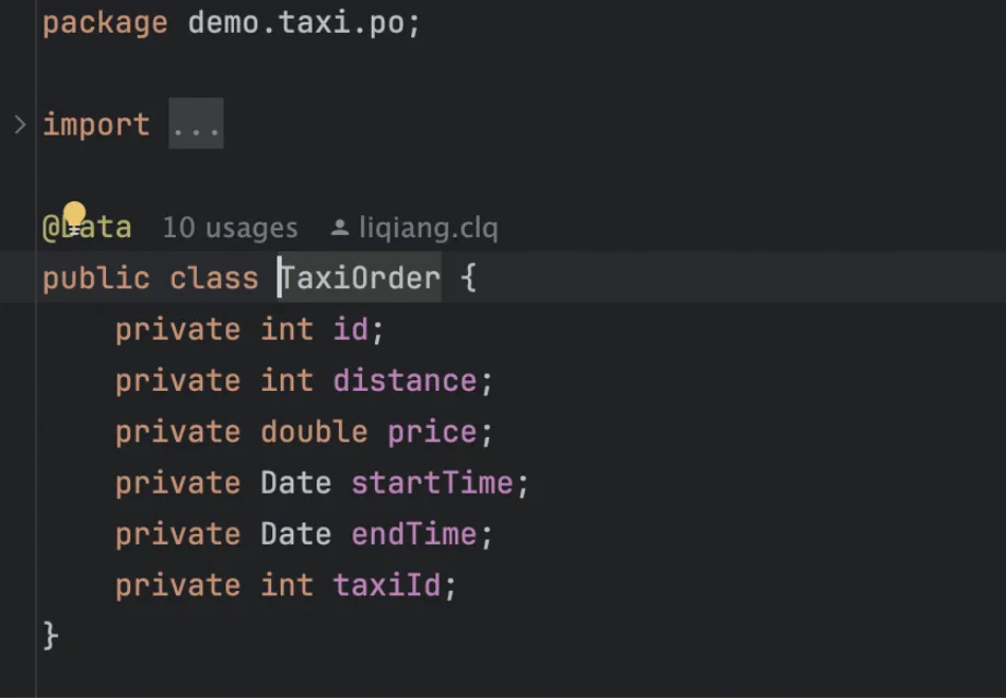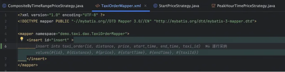 除了 Java、Python、JavaScript 等主流语言项目的跨文件引用,通义灵码还支持在编写 MyBatis 的 xml 文件时自动感知 Mapper 对象上引用的表结构类型。例如在编写如下 insert 语句时,插件会利用当前项目中的 TexiOrder 类型信息,确保生成的每个字段都是正确的。