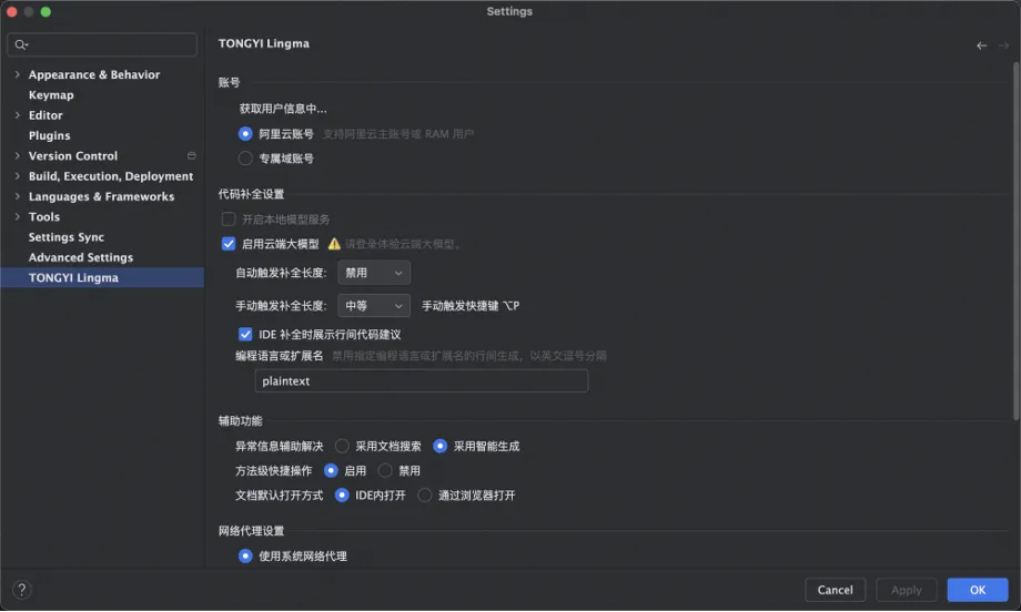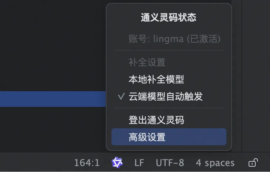 JetBrains IDE 的配置面板在设置页面的顶级菜单 TONGYI Lingma 板块,可以通过点击状态栏的通义灵码小图标,选择“高级设置”项快速打开。