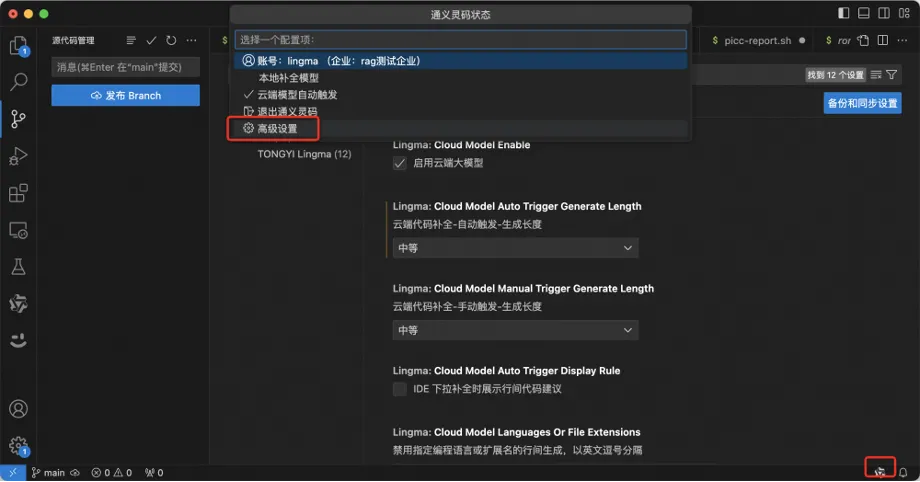 VSCode 的配置面板同样可以从状态栏右下角的通义灵码图标点击“高级设置”进入。