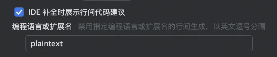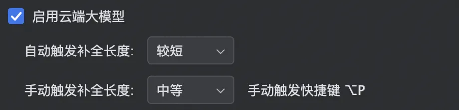 备注说明:禁用特定文件类型的补全功能主要是禁用自动补全触发,若在文件内使用快捷键手工触发补全(默认快捷键位 Alt+P),依然能够使用大模型的内容自动续写生成的功能。