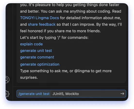 通义灵码插件内置了解释代码、生成单元测试、生成代码注释、生成优化建议四个代码任务,通义灵码大语言模型对这些任务进行过专项训练。例如,在需要生成单元测试的时候,使用内置任务会比框选代码之后再输入生成单元测试效果更佳。